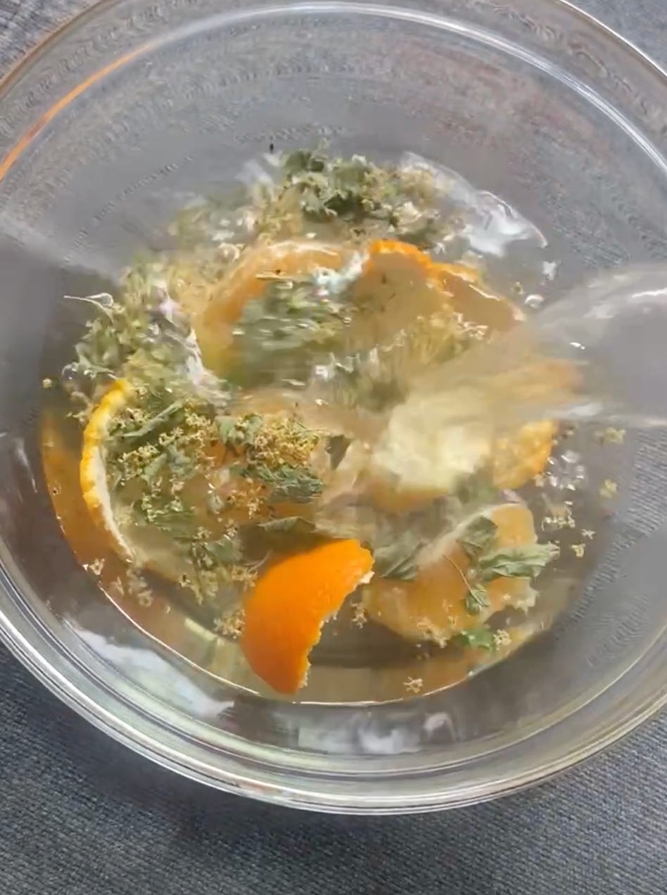 Steams to break up mucous, soothe a sore throat, open up pores to release additional toxins, and warm a tired body. I brought Lemon Balm and Elderflower with me to my family home and added them to a bowl with fresh clementines.